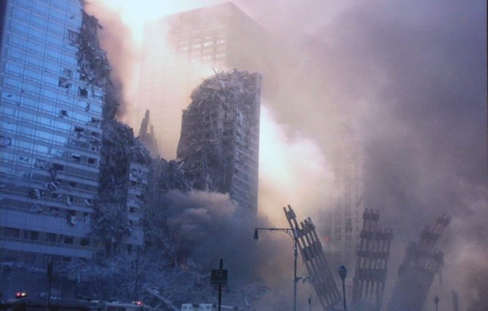 Разрушенные соседние здания от обломков упавшего Всемирного торгового центра вовремя теракта в Нью-Йорке. США, 11 сентября 2001 года. Фото: Bill Biggart.