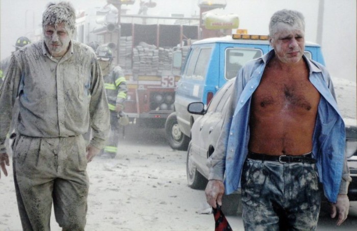 Двое мужчин частично засыпанных пылью вовремя теракта в Нью-Йорке. США, 11 сентября 2001 года. Фото: Bill Biggart.