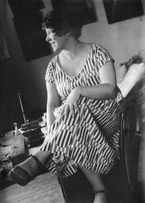Варвара Степанова в платье, сшитом из ткани, по своему эскизу на Первой ситценабивной фабрике. Автор: Alexander Rodchenko.
