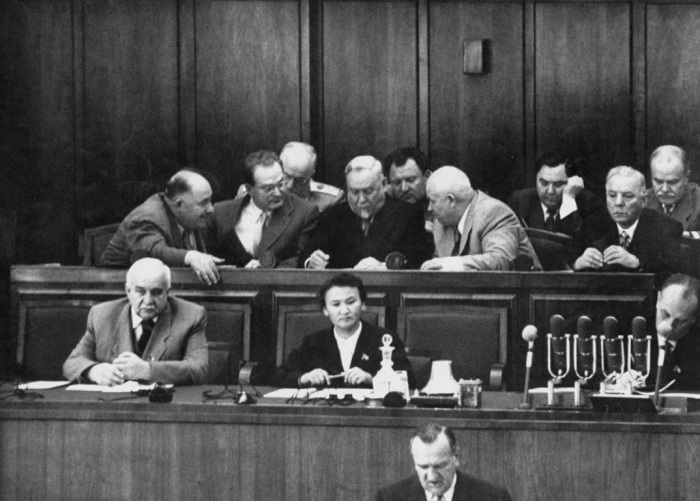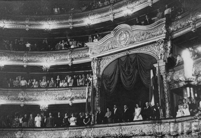 Климент Ворошилов, Никита Хрущев, Николай Булганин в Большом театре вместе с королем Мохаммедом Реза-шахом и его женой королевой Сорейей Эсфандияри.