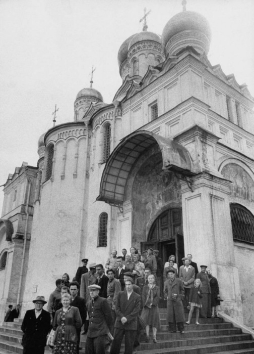 Люди, стоящие у входа в православную церковь перед похоронной процессией на похоронах Ивана Алексеевича Лихачева.
