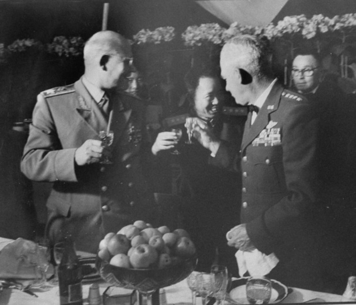 Начальник штаба ВВС СССР Леонид Руденко беседует с бригадным генералом Натаном Твинингом на приеме, организованном после авиашоу.