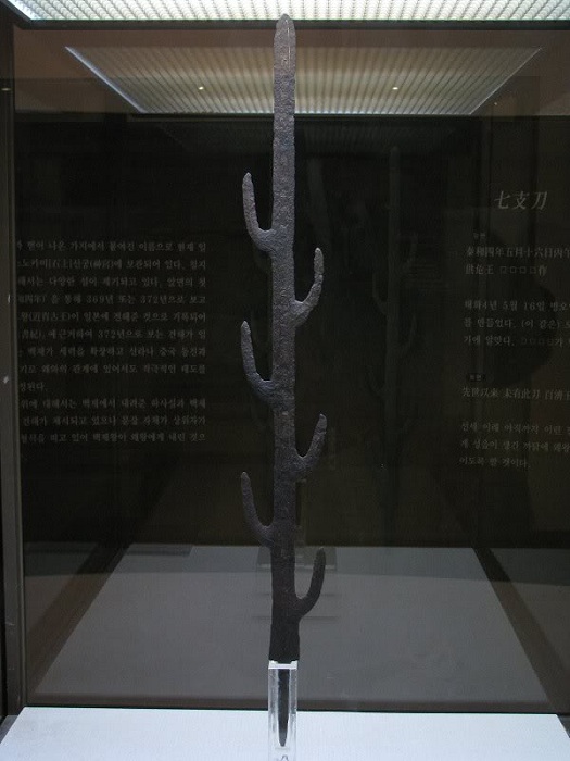 На лезвии удивительного меча есть надпись, в которой он называется подарком корейского правителя китайскому императору. В Нихон сёки, древнейшем японском письменном памятнике, также упоминается семизубый меч. Там он преподнесен в качестве подарка императрице Дзингу.