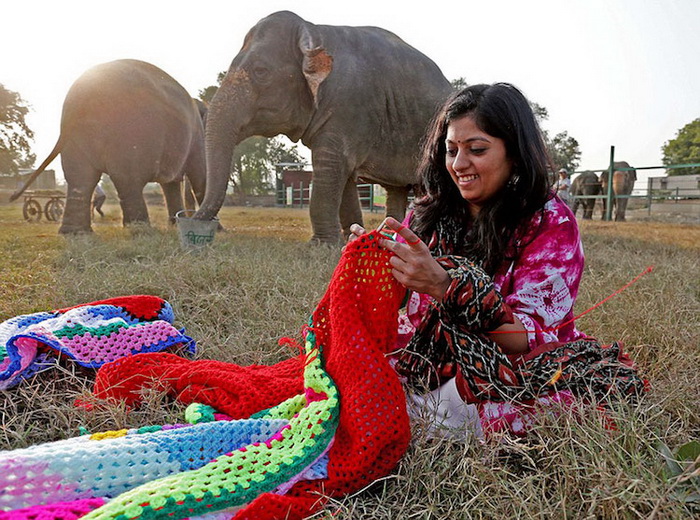 Эта душевная история произошла в индийском городе Матура, в центре Wildlife SOS Conservation and Care Center, где занимаются проблемами диких животных. Из-за резкого похолодания слонов срочно потребовалось утеплить: вначале животных укутывали в пледы, а потом решили вязать для них свитера. Вязанием занялась вся местная деревня: люди с удовольствием приобщились к необычному проекту, многие готовы дни напролет проводить со спицами в руках, чтобы помочь слонам.