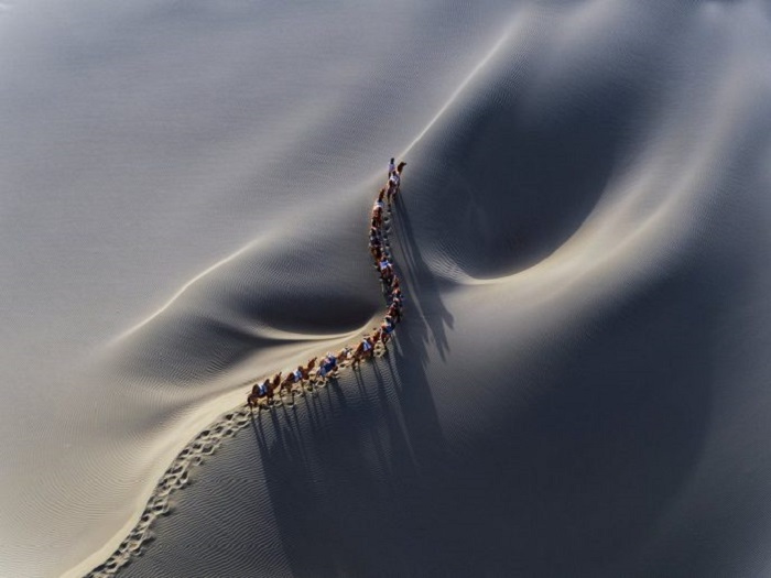 Аэрофотография, на которой запечатлён караван верблюдов в пустыне, выиграла первый приз в профессиональной категории «Красота». Автор фото: Ханбинг Ван