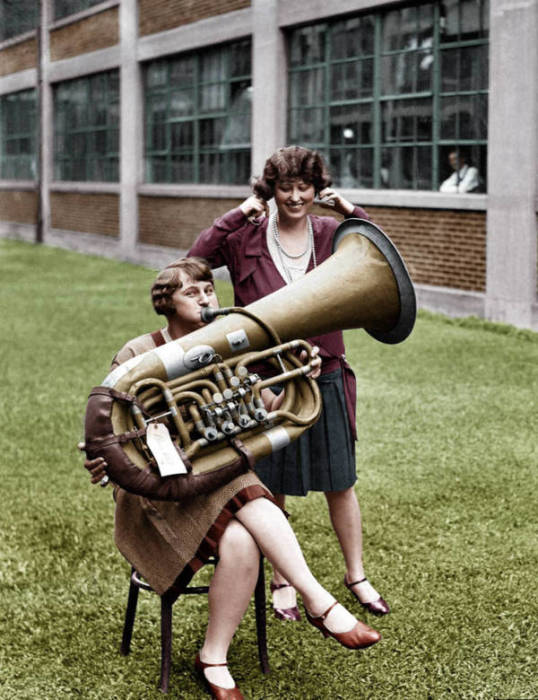 Девушки с медным духовых музыкальным инструментом тенорового регистра. Вашингтон, округ Колумбия, 1928 год.