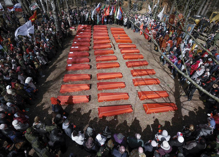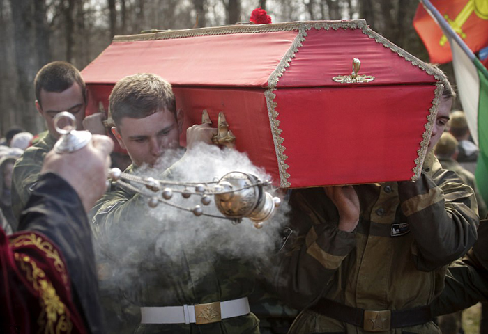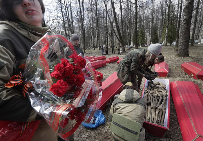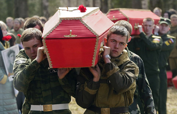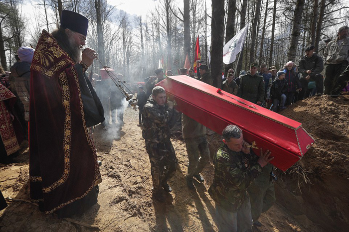 Люди собрались в Синявино, недалеко от Санкт-Петербурга, чтобы воздать почести погибшим солдатам. К сожалению, не всегда удавалось найти полностью сохранившиеся скелеты, от некоторых бойцов оставались только отдельные кости. Солдат было решено похоронить в 41 гробу, оббитых ярко-красной тканью.